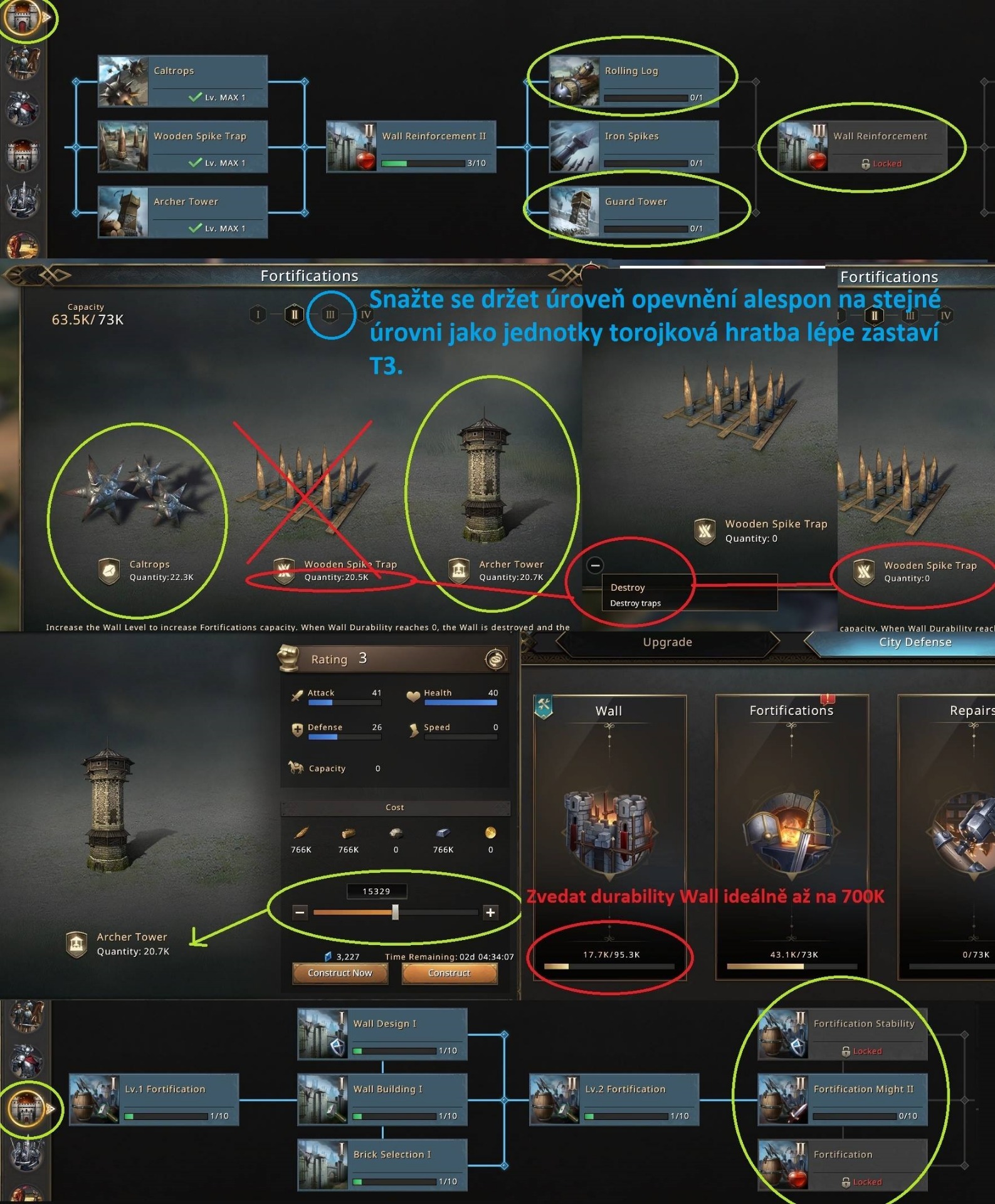 Potřebujeme jako aliance posílit v obraně abychom nepřátelským nájezdníkům začali způsobovat takové škody že na nás raději útočit nebudou. Jistě si hodně z vás všimlo že když na nás útočí i nejsilnější hráči z aliancí 1KS a Lanisters tak se vyhýbají útokům na hráče Darvais, hlavní důvod je že má Durability Wall přes 700k a na vysoké úrovni má i Archer Tower a Caltrops nestaví Spike jelikož ty jsou dle všeho v obarně neúčinné. Doporučujeme tedy Spike zbourat a místo nich postavit více "věží a sudů" Ideálně je stavět alespoň na úrovni jako máte armádu tedy většinou asi věže 3 úrovně. K nim obranu doplnit o lučišníky a kontaktní jednotku která je bude chránit pokud zeď padne. Ve výzkumu se hodně věnujte City Defense a Advanced Defense.V nich pak zkoumejte: Wall reinforce, Wall desing, Wall Buildings, fortification a Brick selection na nejvyšší úroveň co vám půjde až dosáhnete také 700k silné zdi tak na vás nepůjde nikdo a pokud ano bude mít i statisícové ztráty.