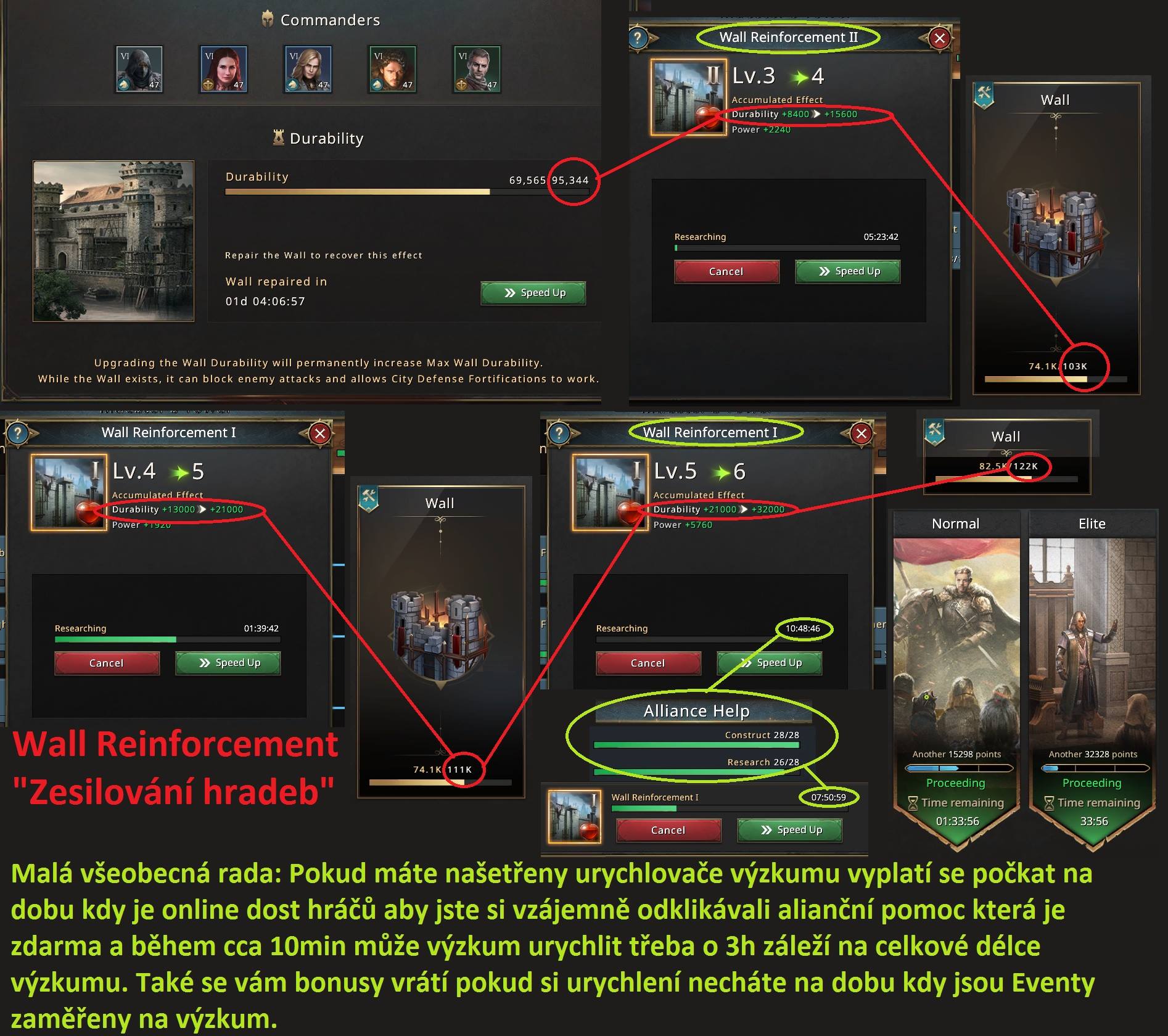 Pokud máte našetřené urychlovače výzkumu vyplatí se počkat na dobu kdy je online dost hráčů aby jste si vzájemně odklikli ali pomoci která je zdarma a během cca 10min můžete výzkum urychlit třeba o 3h záleží na celkové délce výzkumu. Také se vám bonusy vrátí pokud si urychlováky necháte na dobu kdy jsou Eventy zaměřené na výzkum.