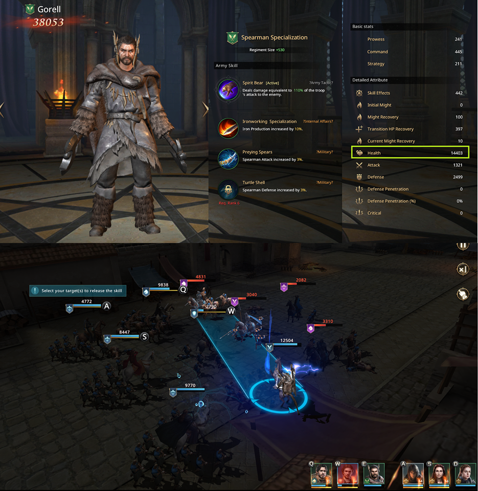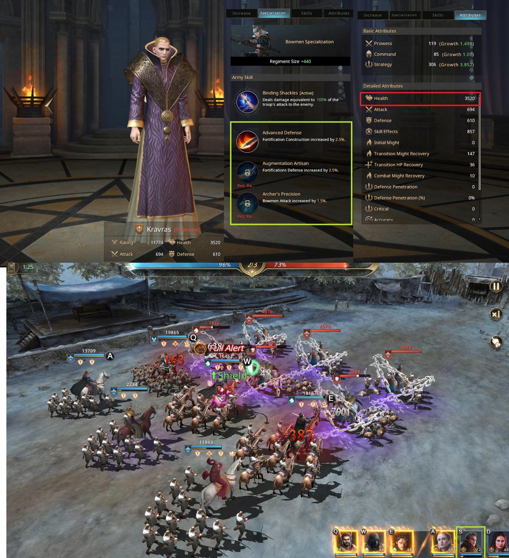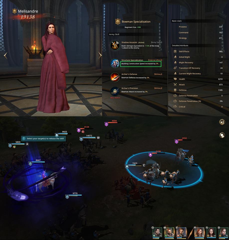 Do druhé linie jako lukostřelec, Na levelu 25 působí cca 1000hp poškození všem šesti nepřátelům, s 50% šancí způsobit 2s omráčení.