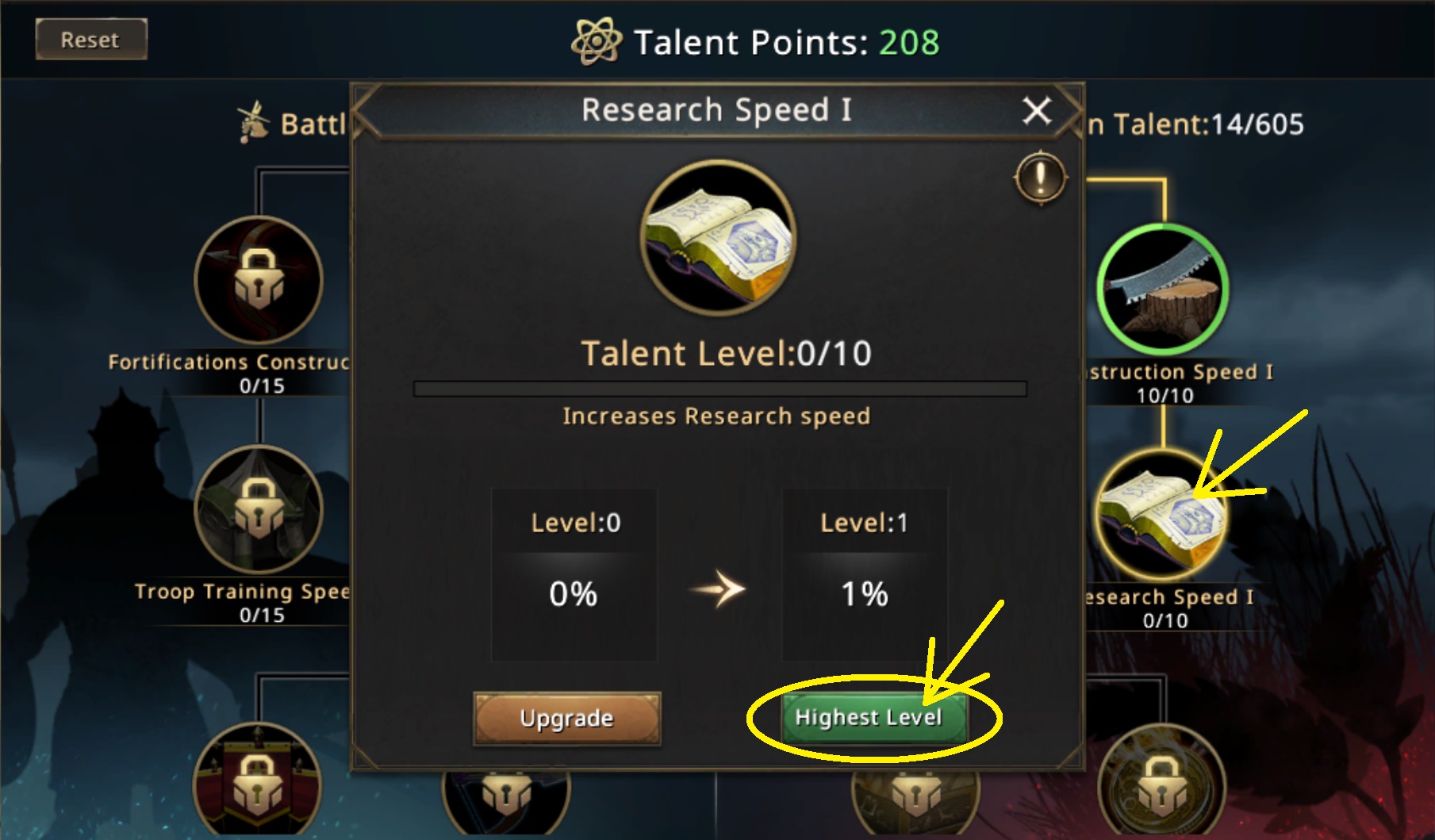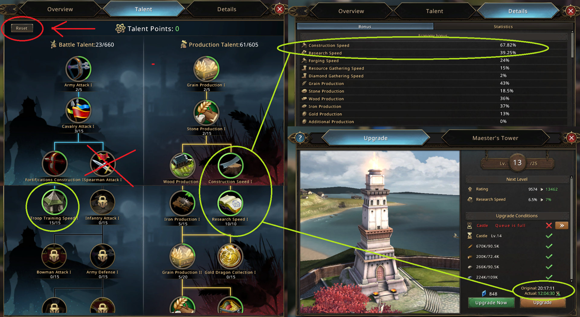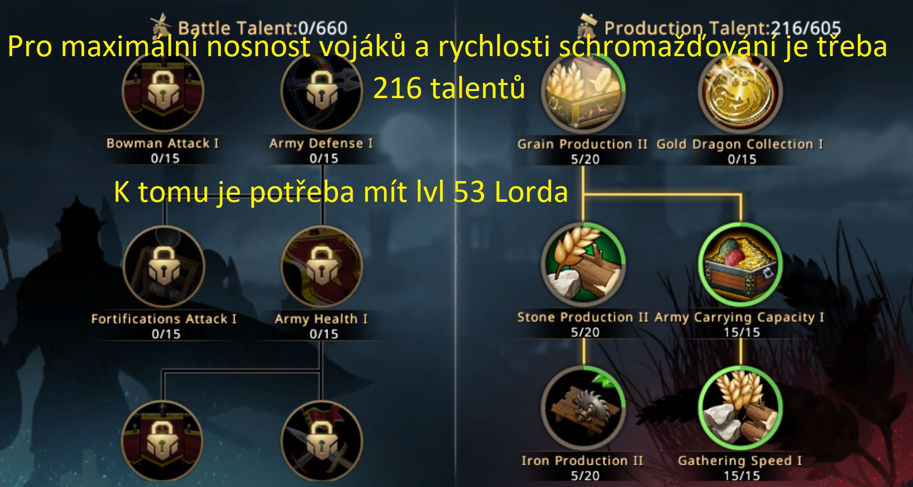 Chcete rychleji stavět, zkoumat a cvičit vojsko? Možná budete muset resetovat talenty pokud jste se v nich vydali špatnou cestou, Na Betě jsem je také musel resetovat a pak jsem se dostal ve stavbách na 120% a tedy stavba co běžně trvala 2 dny již netrvala ani den.