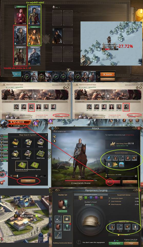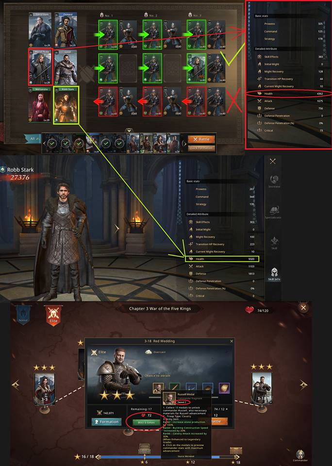 Hodně záleží jak jednotky rozestavíte, v jedné formaci neprorazíte ale v jiné s přehledem ani to tolik není o tom posílat "kopiniky" proti jízdě je výhoda třeba mít postavenou jízdu proti pěchotě a pěchotu proti kopí. "kopinici" v této hře jsou spíše vrhači kopí do druhé linie vyjímkou je třeba hrdina Gorell který diky vysokym HP může být v první linii. Spíše je to ale tom mít v předu hrdiny s hodně HP jako je Robb, Osmond, Gorell...a v zadu ty s vysokým útokem či útokem na více jednotek naráz, kteří ale často mají málo HP. Nezapomínat hlavně i na healerku Sansu at vaši armádu můžete ve Weirwoodu léčit.