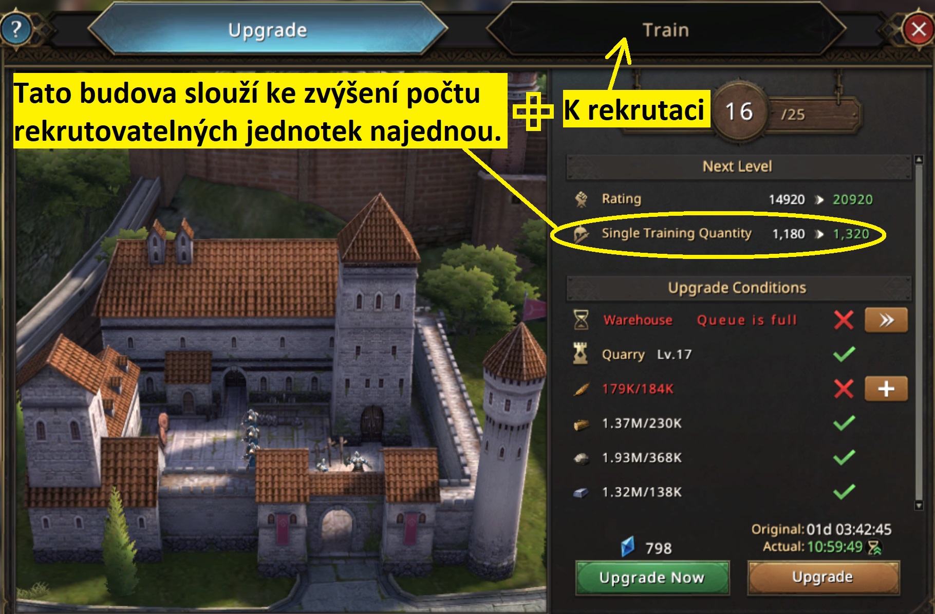 Budova Barracks- Kasárny zde se rekrutuji vojska a to T1 veteráni Elite Infantry-Elite Cavalry-Elite Spearman-Elite Bowmana T2veteráni Elite Infantry-Elite Cavalry-Elite Spearman-Elite Bowman Je to spojené s výzkumem Military Basic aby jste dosáhli vojska T2 musíte nejdřív ve výzkumu vyzkoumat skupinu T2 musíte ale být trpělivý ten výzkum tvá dost dlouho né hodiny ale 2dny. někdy 3 dny.A také musíte mít dostatek surovin přesněji zlata.Kdo má urychlovače času nebo diamanty může to tím to způsobem urychli.