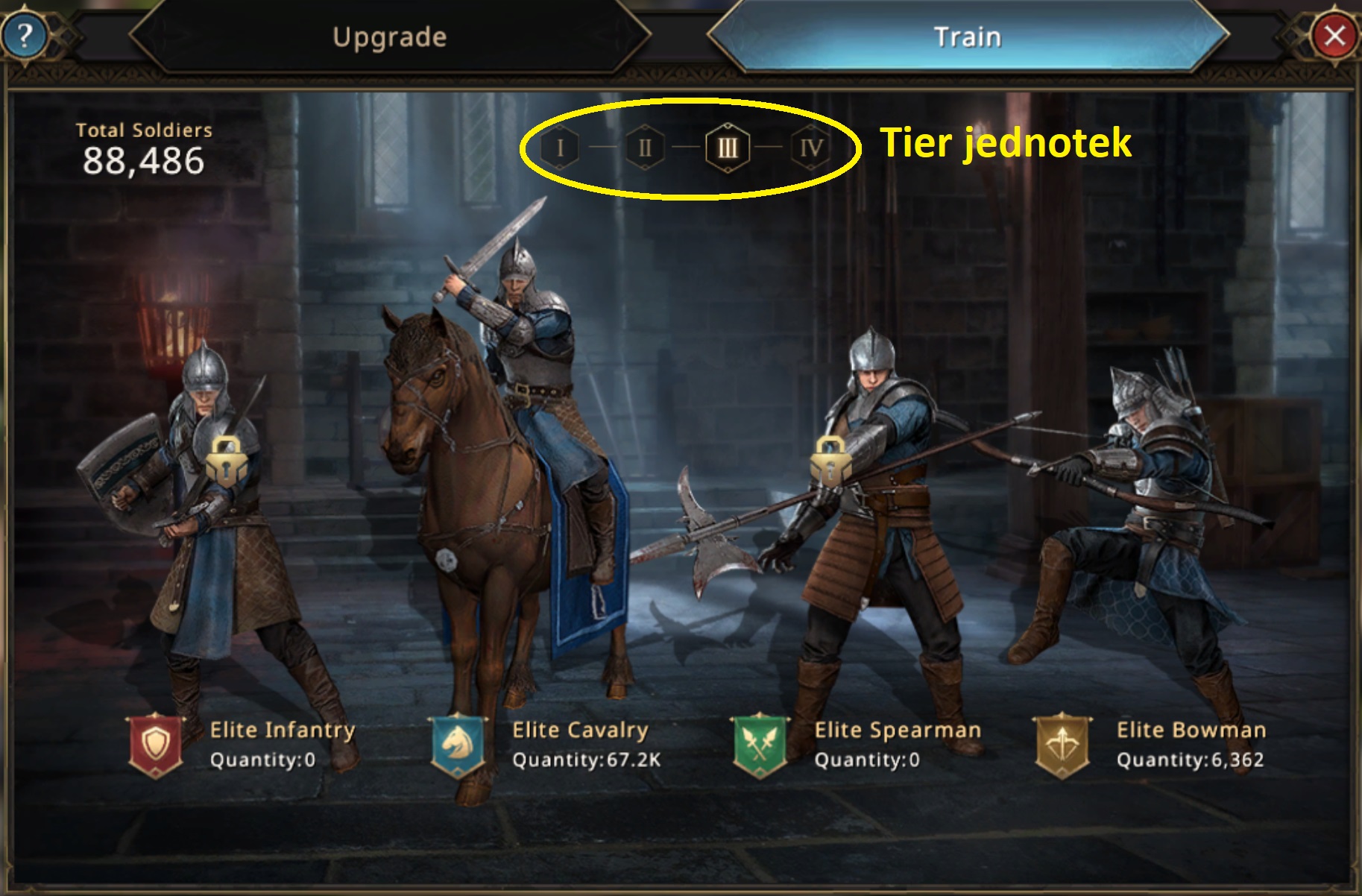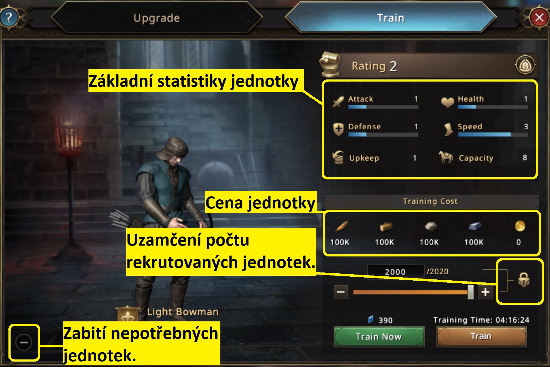T2 vojsko je pak dobré využívat na silnější campeny rebelu.Také při rekrutaci vojska uT2 při rekrutaci lzde zadat více vojsk které se rekrutuje u T1 jde 4400 a u T2 5500.Rozpis u každé jednotky najdete základní statistiky jednotky-cena jednotky-Uzamčení počtu rekrutovaných jednotek-Zabití nepotřebných jednotek.