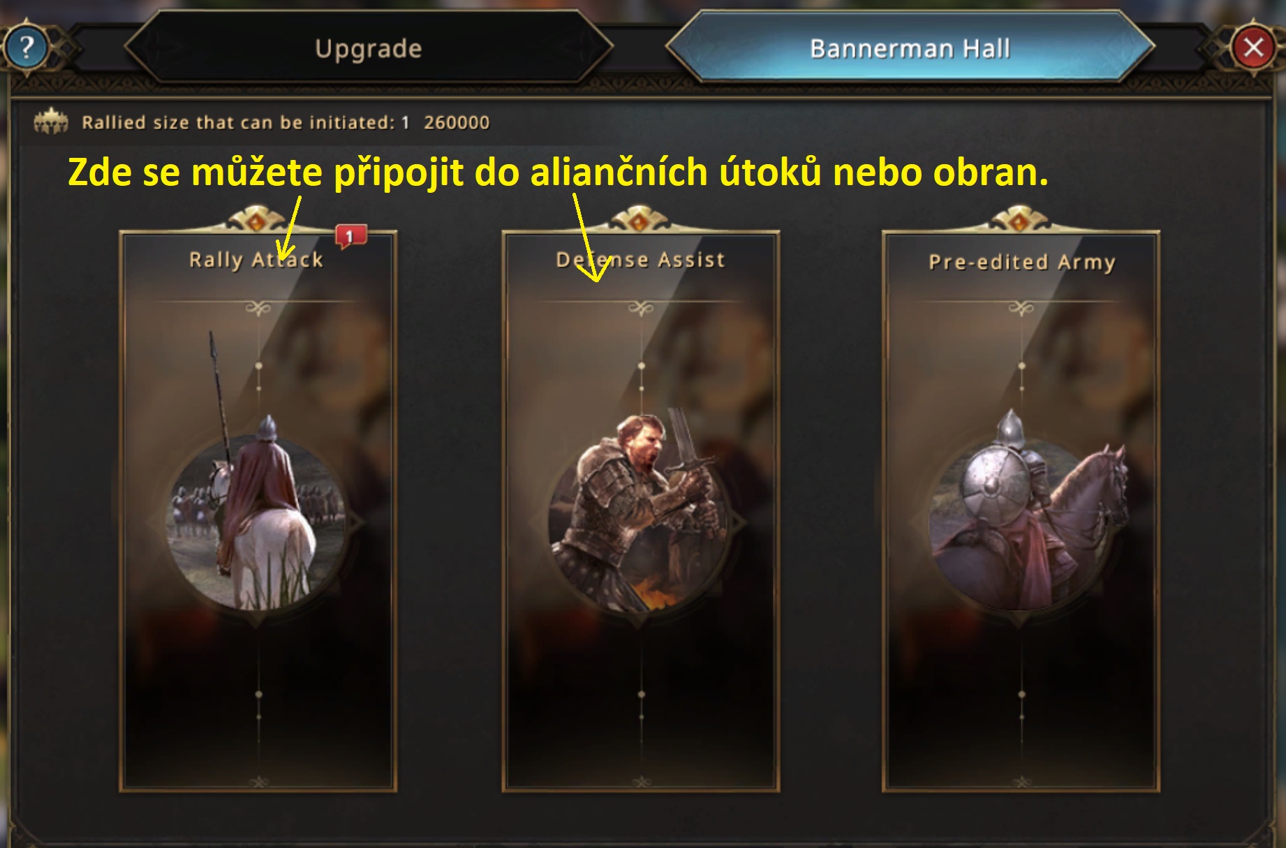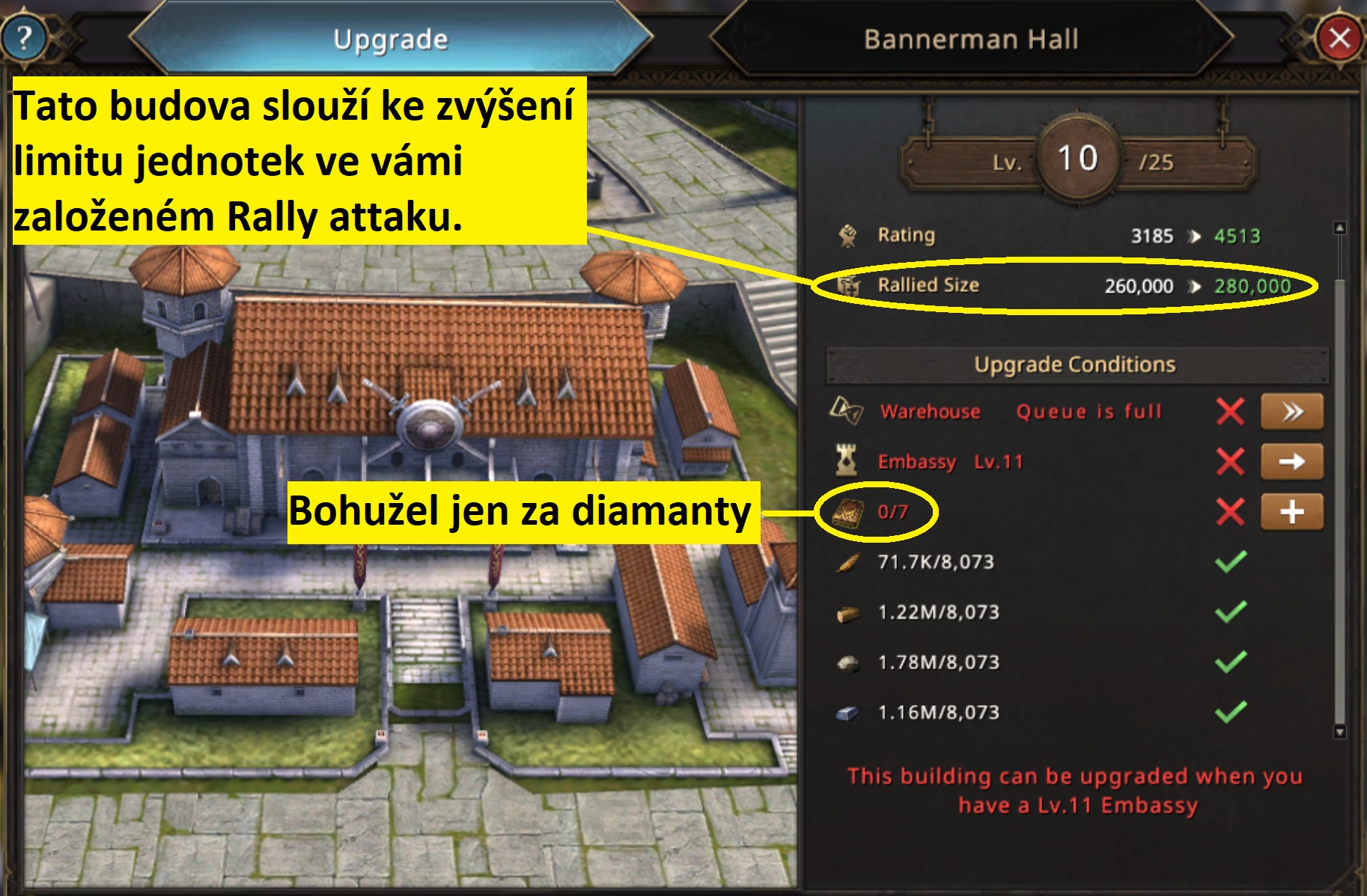 Také Budova Army Tent slouží jen ke zvýšení počtu rekrutovaných jednotek najednou.Další budova Bannerman Hall slouží ke zvýšení limitu jednotek ve vámi založeném Rally attaku. Z Bannerman Hall se můžete připojit do aliančních útoků nebo obran.