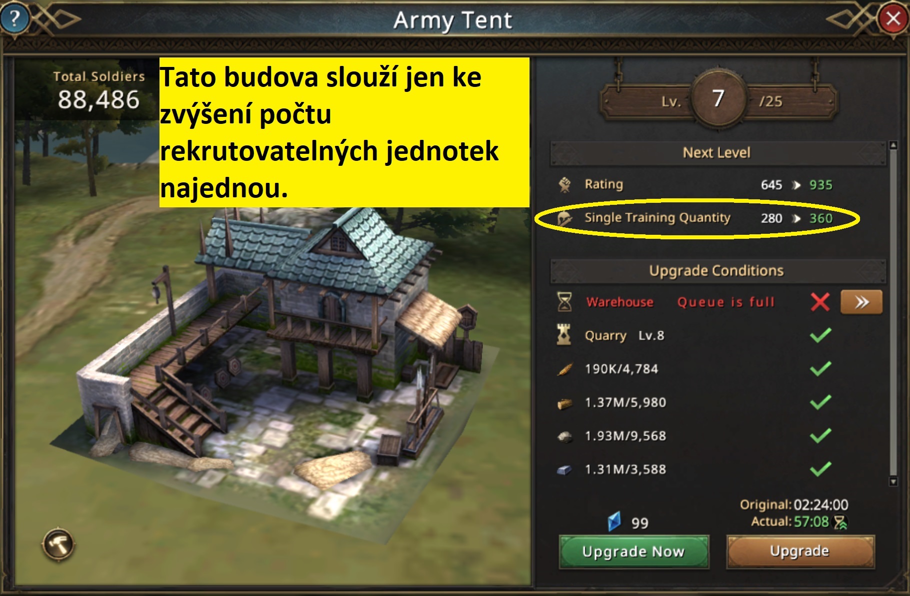Jinak počet vojáku a vojska číselně se odvíjí ideálně je mít stálou armádu cca 40.000.Ale samozřejmě ze začátku to tak rychle nejde tak že to jde od 10.000 nahoru pak 20.000 atd....Nezapomeňte schovávat vojsko do skrýše pokud jdete od hry a to i s vaším Lordem. Nezapomínejte po každé bitvě se pokud a no svítí nad nemocnicí červený křížek to je znamení že máte v nemocnici raněné ty vyléčíte pokud je vojska méně tak i zdarma pokud více stoji to suroviny nejvíce pšenici.